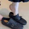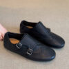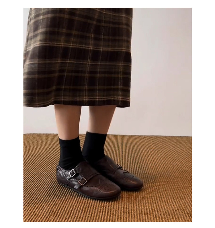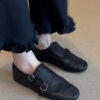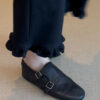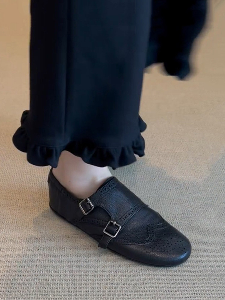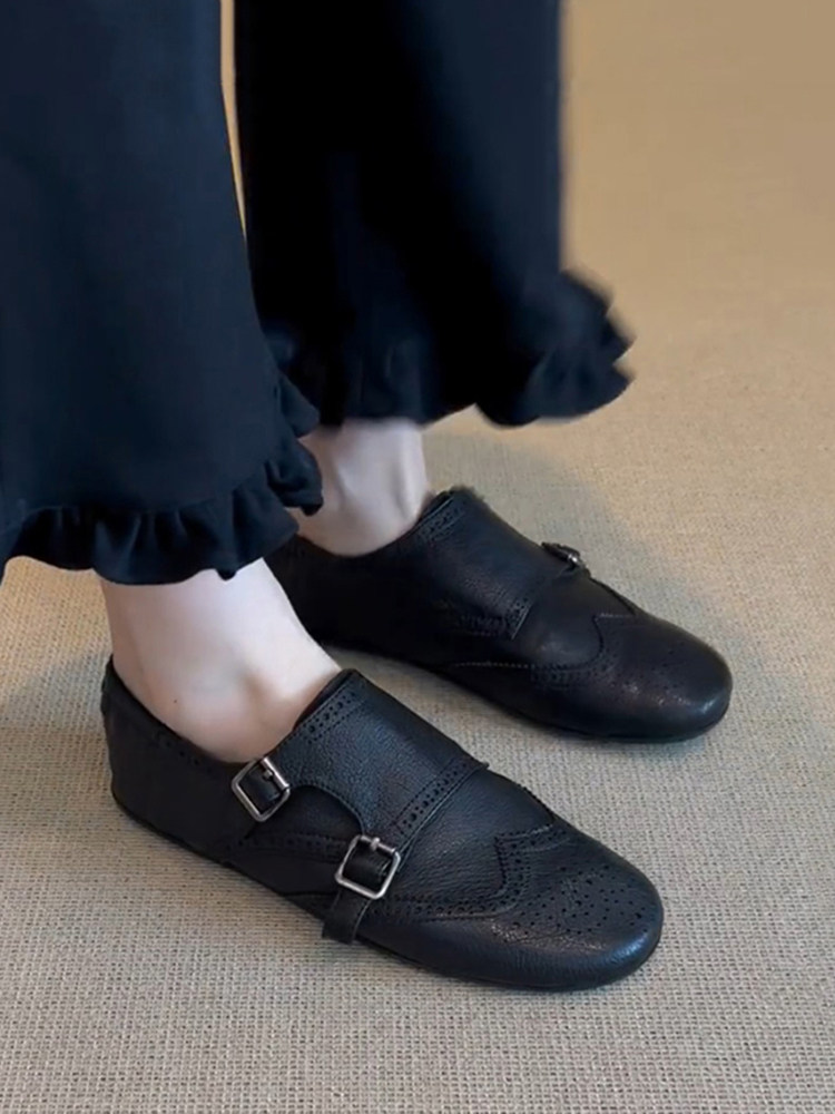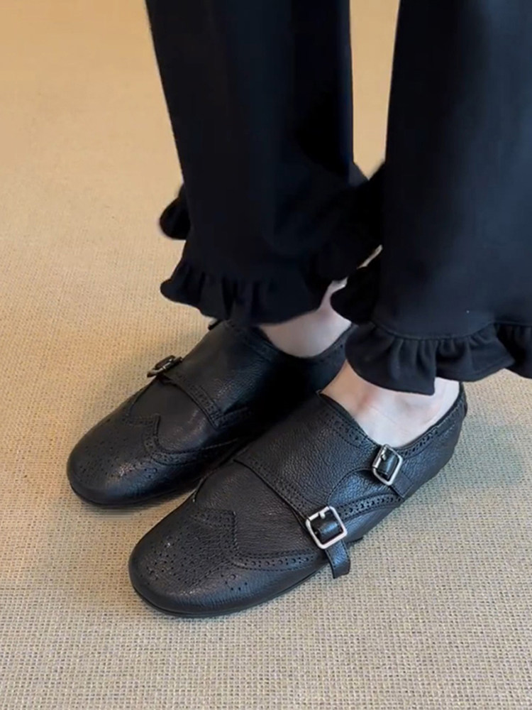 The ultimate bridge between classic menswear tailoring and modern feminine ease. Designed for the woman who appreciates the “Dark Academia” aesthetic and the structure of a traditional oxford, but demands the flexibility of a ballet flat. Featuring a rich, pebbled black leather and intricate perforated detailing, these Brogue Monk Strap Flat Shoes offer an intellectual, sophisticated edge for the modern professional.